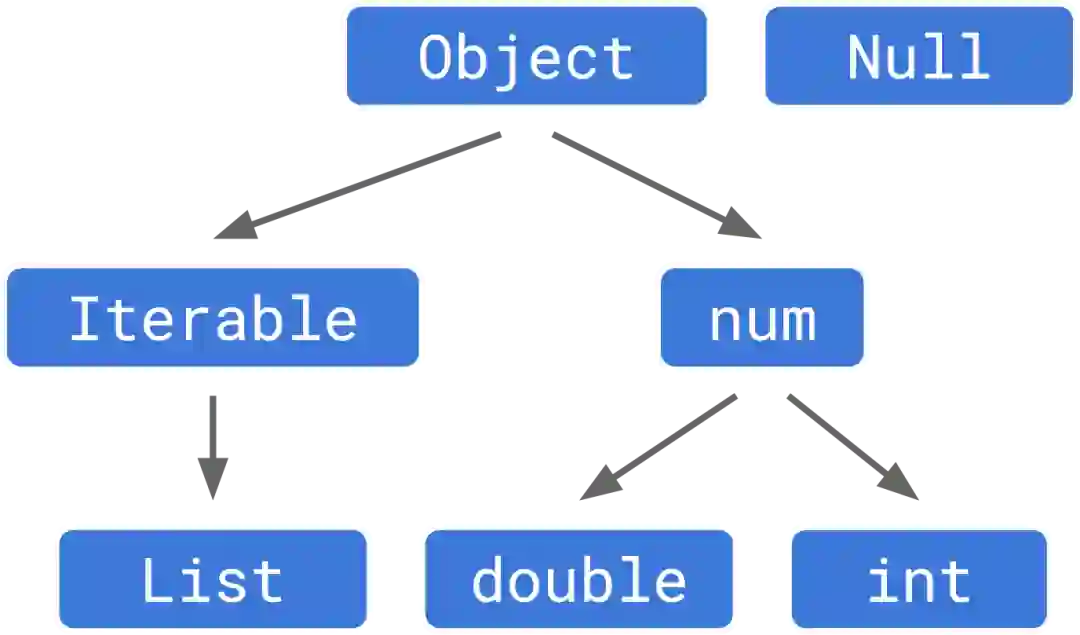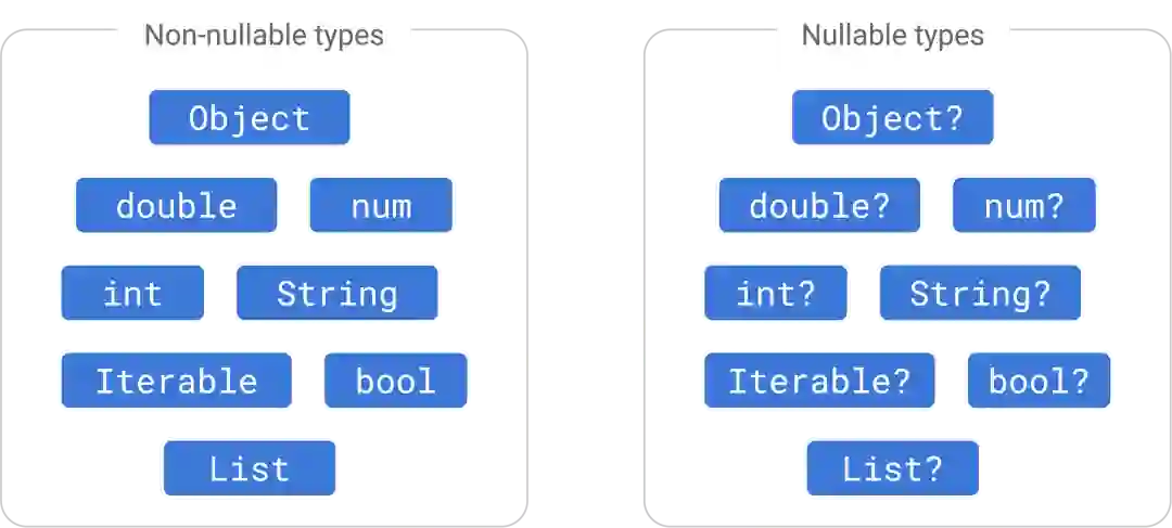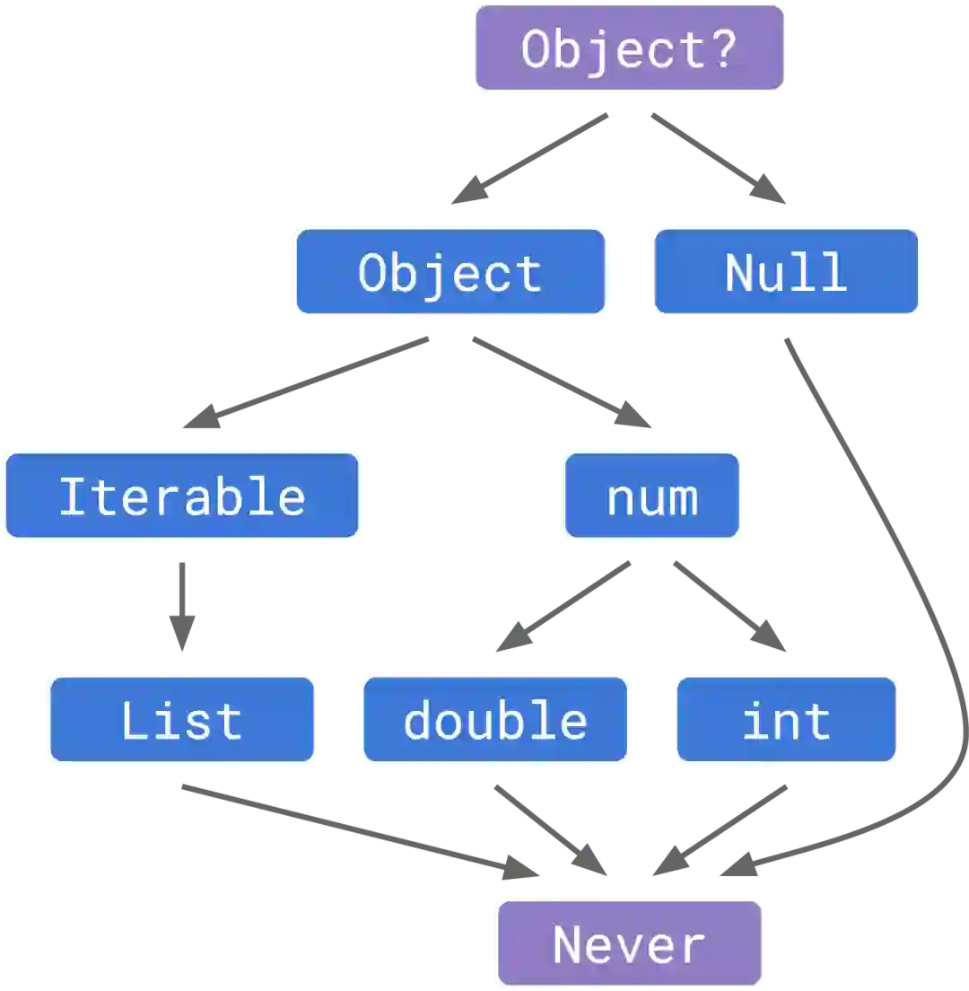 因为一切均建立于静态类型系统上,所以空安全也始于此处。您的 Dart 程序中包含了整个类型世界: 基本类型 (如 int 和 String)、 集合类型 (如 List) 以及您和您所使用的依赖所定义的类和类型。在空安全推出之前,静态类型系统允许所有类型的表达式中的每一处都可以有 null。