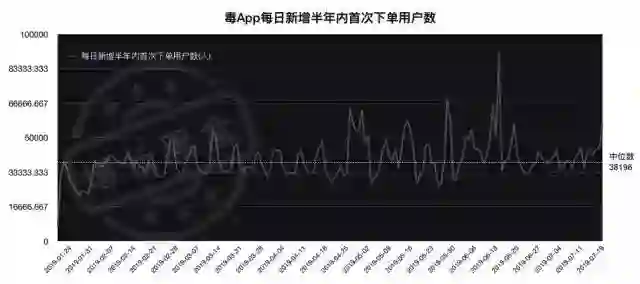 可以看出专业买家半年内首次下单用户数,虽然每月之间略有波动,但总体趋势是在逐渐增长,越来越多的专业买家正在加入毒App。