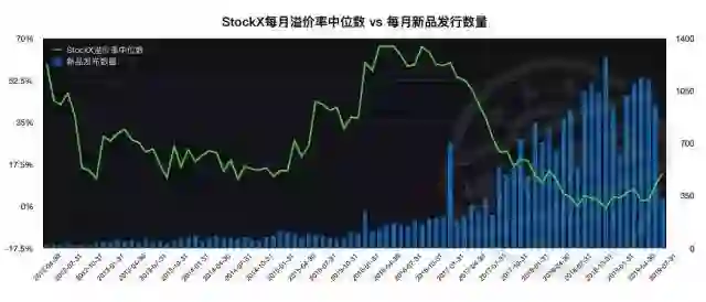 通过对比分析StockX自2012年起6年间的每月溢价率中位数和市场上的球鞋新款发售频率,我们可以发现球鞋的溢价与发行频次高度负相关: