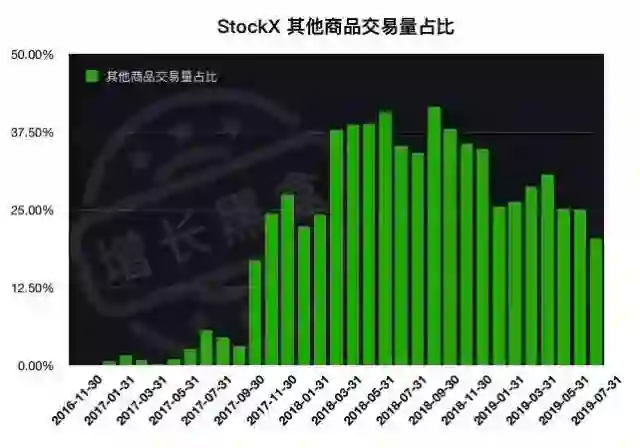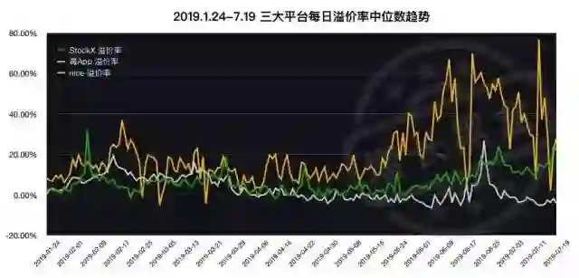 可以看出,StockX近一年的溢价率相对稳定,多数时间保持在0%-20%之间,在2019年1月、6月、7月间有所上涨。