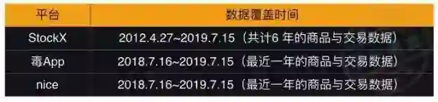 为了还原球鞋转卖交易市场的真实情况,我们此次分析使用了 StockX、毒App、nice 三大平台 App 端的所有可见公开数据,总计约11万条商品数据以及2242万条交易记录。