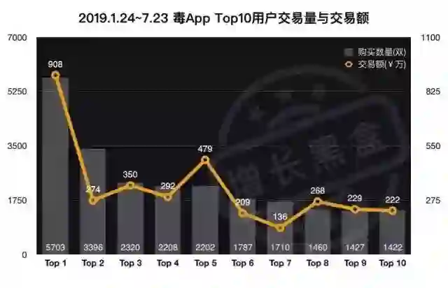 为了研究球鞋交易的用户,我们统计了毒App上半年内(2019年1月24日~7月23日)购买球鞋最多的前十位用户,并计算了他们的购买数量以及交易额。
