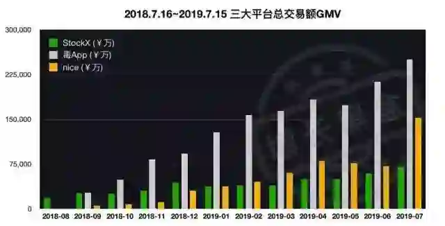 其中StockX增速最缓慢但是平稳;nice在2019年初GMV开始反超StockX,而后nice在资本的加持下,7月份以超过200%的速度增长,已隐隐有在GMV上赶超毒App的势头。
