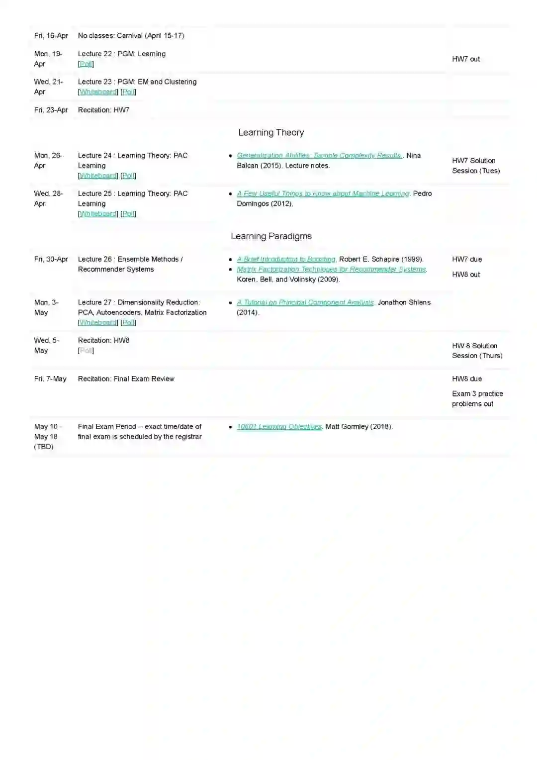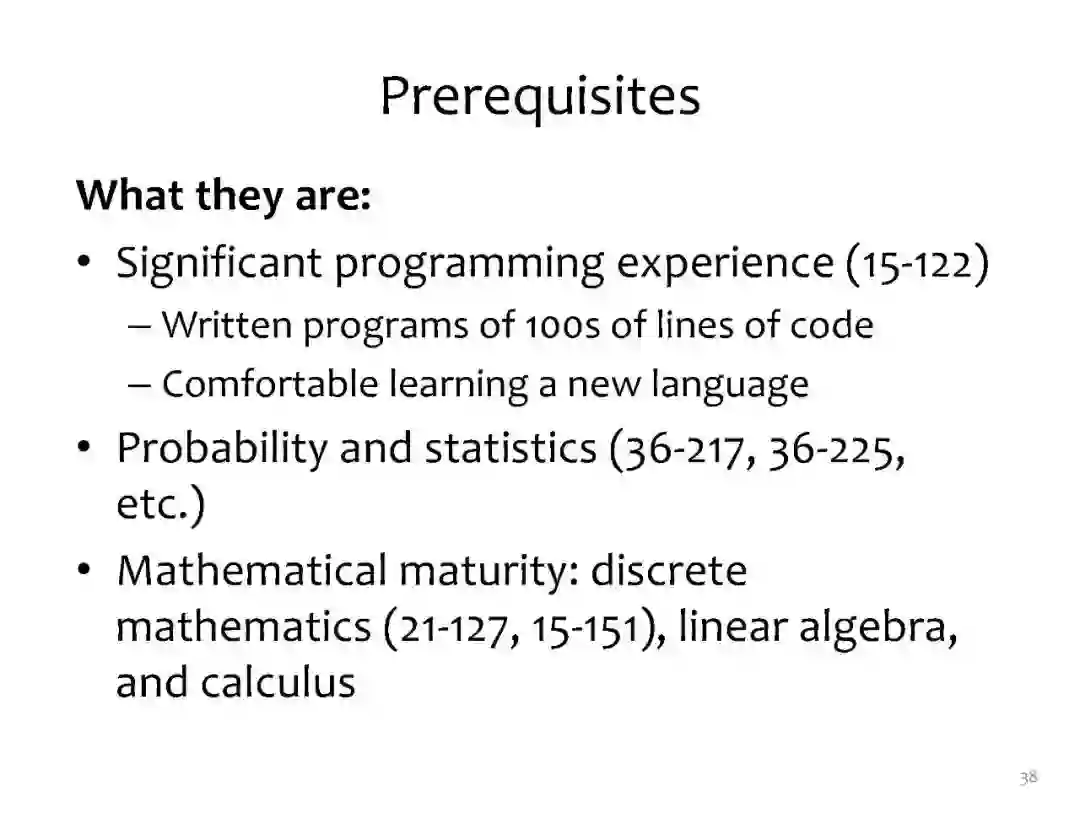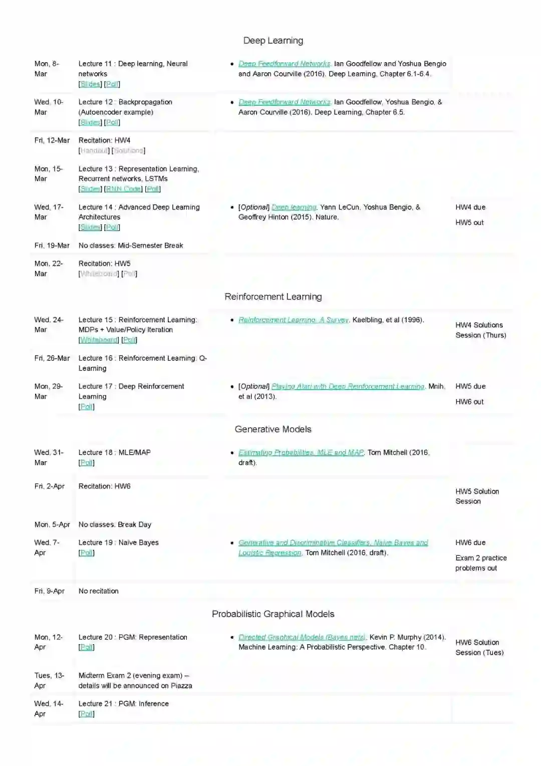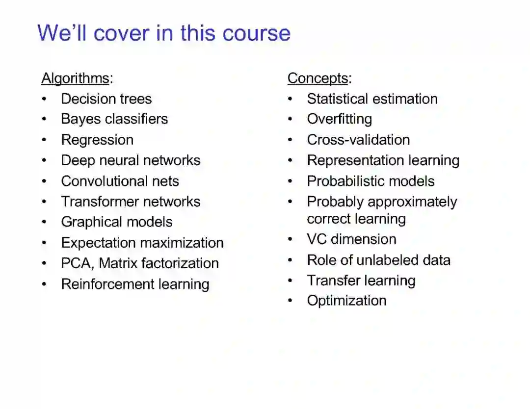 机器学习涉及的是通过经验自动提高其性能的计算机程序(例如,学习人脸识别,推荐音乐和电影,以及驱动自主机器人的程序)。本课程从多种角度涵盖了机器学习的理论和实际算法。我们涵盖了贝叶斯网络、决策树学习、支持向量机、统计学习方法、无监督学习和强化学习等主题。课程涵盖的理论概念如归纳偏差,PAC学习框架,贝叶斯学习方法,基于边际的学习,和奥卡姆剃刀。编程作业包括各种学习算法的动手实验。本课程旨在为研究生提供机器学习研究人员所需要的方法论、技术、数学和算法的全面基础知识。