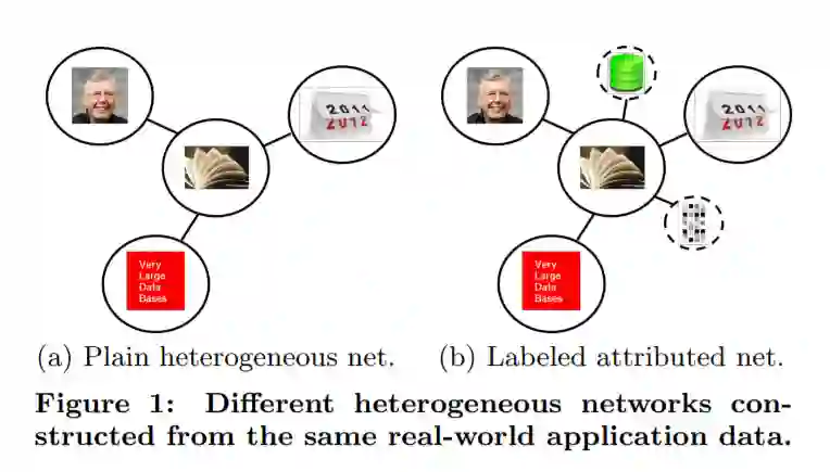 网络和图形构成了一种规范的、普遍存在的交互对象建模范式,已经引起了各个科学领域的重要研究关注[59、30、24、3、89、87]。然而,现实世界的对象和交互通常是多模态和多类型的(例如,作者、论文、场所和出版物网络中的术语[69,65];基于位置的社交网络中的用户、地点、类别和gps坐标[101,91,94];以及生物医学网络中的基因、蛋白质、疾病和物种[38,14])。为了捕获和利用这种节点和链路的异构性,异构网络被提出并广泛应用于许多真实的网络挖掘场景中,如基于元路径的相似度搜索[70、64、92]、节点分类和聚类[18、20、11]、知识库补全[68、48、103]和推荐[23、106、31]。