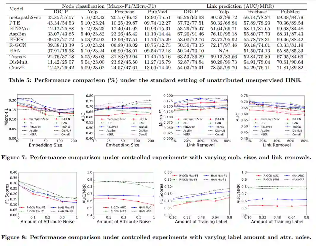 作为第三个贡献,许多现有的HNE算法(包括一些非常流行的算法)要么没有一个灵活的实现(例如,硬编码的节点和边缘类型、固定的元路径集等),要么不能扩展到更大的网络(例如,在训练期间的高内存需求),这给新的研究增加了很多负担(例如,,在正确的重新实现中需要大量的工程工作)。为此,我们选择了10种流行的HNE算法,在这些算法中,我们仔细地重构和扩展了原始作者的实现,并为我们准备好的数据集的插件输入应用了额外的接口(第5节)。基于这些易于使用和有效的实现,我们对算法进行了全面的经验评估,并报告了它们的基准性能。实证结果在提供了与第3节的概念分析相一致的不同模型的优点的同时,也为我们的基准平台的使用提供了范例,以供今后对HNE的研究参考。