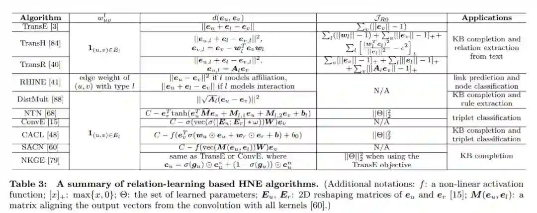 异类网络中的每条边都可以看作是一个三元组(u, l, v),由两个节点u, v∈v和一个边缘类型l∈TE(即。,实体和关系,用KG表示)。关系学习方法的目标是学习一个评分函数sl(u, v),该函数对任意三元组求值并输出一个标量来度量该三元组的可接受性。这种思想在KB嵌入中被广泛采用。由于已经有关于KB嵌入算法的调查[81],我们在这里只讨论最流行的方法,并强调它们与HNE的联系。