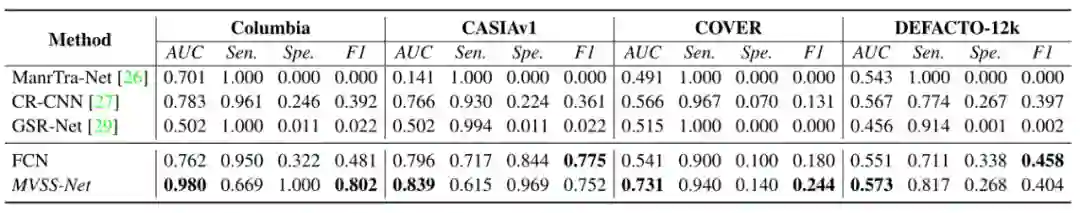 表 1:MVSS-Net消融实验,(DEFACTO-84k训练,DEFACTO-12k测试)