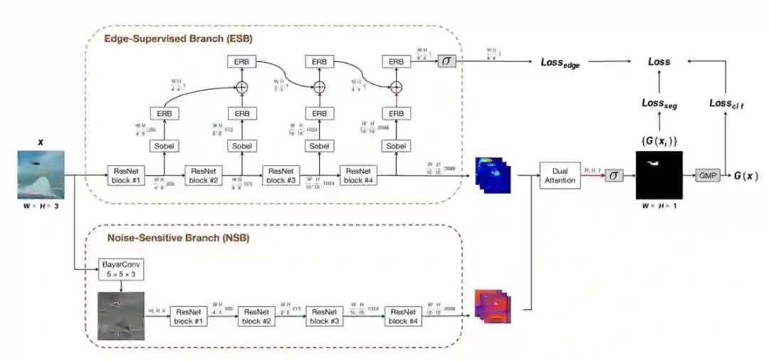 如图1所示,MVSS-Net由两个以ResNet-50为主干的分支组成。上方的边缘监督分支(edge-supervision branch, ESB)用于捕捉篡改区域与未篡改区域在边界处的微小差异;下半部分的噪声敏感分支(noise sensitive branch, NSB)旨在捕获篡改区域和未篡改区域之间的噪声不一致性。边界差异和噪声不一致都是语义无关的特征。