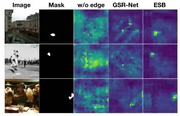 ESB设计的关键构造一个合适的输入。最后一个残差块的深层特征不适合捕捉浅层的边缘信息,会影响篡改趋于分割的主干任务;而浅层特征中包含的细微边缘信息很容易在多次卷积后消失。因此,有必要共同使用浅层特征和深层特征。然而,我们认为先前的工作,如[2]中,使用的简单特征拼接不能保证深层次的特征从ESB中得到足够的指导,因此我们提出以浅到深的方式构造ESB的输入。如图1所示,我们将不同ResNet块的特征以渐进的方式组合在一起进行边缘检测。为了增强边缘相关的信息提取,我们引入了Sobel层。特征首先经过Sobel层,再经过边缘残差块,最后与下一层特征进行合并(求和)。图2是Resnet最后一个残差块的特征图可视化,对比可见,ESB在篡改区域附近产生了更集中的响应。