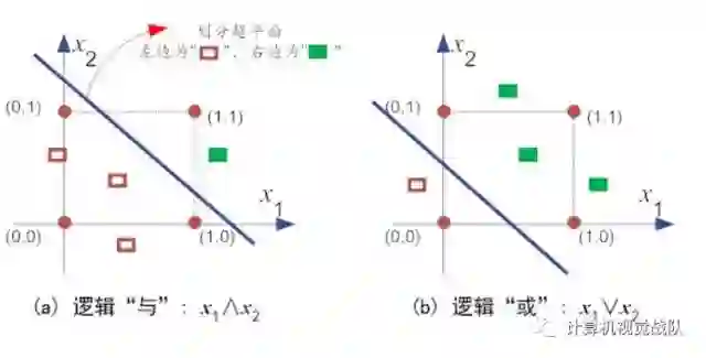 图5-6 线性可分的“与、或、非”和线性不可分的“异或”