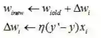 如此一来,感知机的学习规则就可以更加简单明了,对于训练样例(x,y)(需要注意的是,这里粗体字x表示训练集合),若当前感知机的实际输出y’,假设它不符合预期,存在“落差”,那么感知机的权值依据如公式(5.2)规则调整: