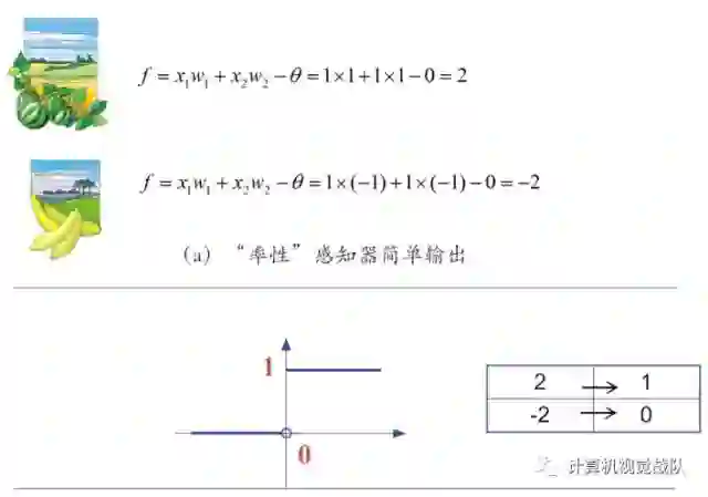 假设特征x1代表输入颜色,特征x2代表形状,权重w1和w2默认值都为1,为了进一步简化,我们把阈值θ(亦有教程称之为偏值——bias)设置为0。为了标识方便,我们将感知器输出为“1”,代表判定为“西瓜”,而输出为“0”,代表判定为“香蕉”。当然了,如果有更多类别的物品,我们就用更多的数字来标记即可。