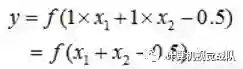 (2)类似地,“或(x1∨x2)”:当w1=w2=1,阈值θ=0.5时,有: