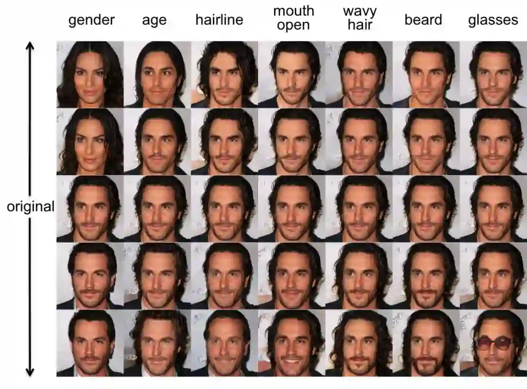 风格迁移,以 CycleGAN 和 pix2pix 为代表,是用来将图像从一个领域迁移到另一领域(例如,从马到斑马,从素描到彩色图像)的模型。因此,我们不能在两个离散状态之间连续调整一个特征(例如,在脸上添加更多胡须)。另外,一个网络专用于一种类型的迁移,因此调整 10 个特征需要十个不同的神经网络。