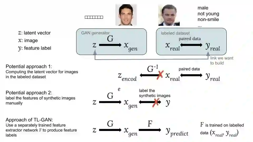 为了解决该问题,TL-GAN 模型做出了一项重要创新,即利用已有标注图像数据集 (x_real, y_real) 训练单独的特征提取器(用于离散标签的分类器或用于连续标签的回归器)模型 y=F(x),然后将训练好的 GAN 生成器 G 与特征提取器网络 F 结合起来。这样,我们就能利用训练好的特征提取器网络来预测合成图像 x_gen 的特征标签 y_pred,从而通过合成图像建立 z 和 y 之间的联系,即 x_gen=G(z) and y_pred=F(x_gen)。