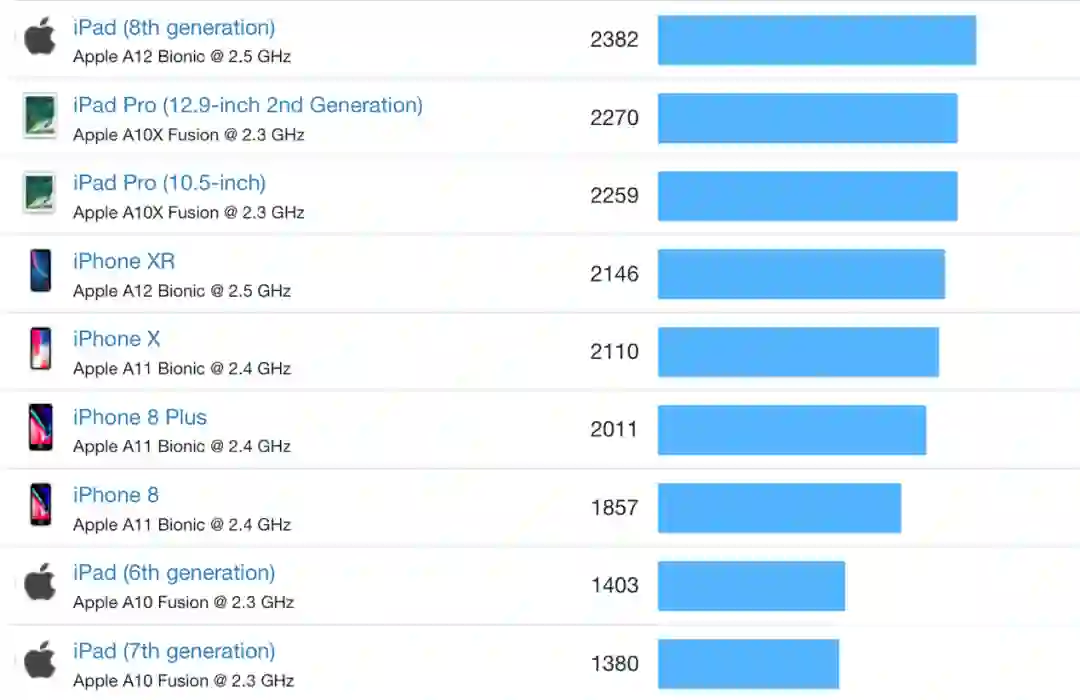 根据 GeekBench 5 的数据,搭载 A10 Fusion 的 iPad 多核得分大约是1400分,而搭载 A12 的 iPad,分数可以达到 2831,提升了几乎一倍,而面向图形处理能力的 Metal 得分,也有大约 65% 的提升。