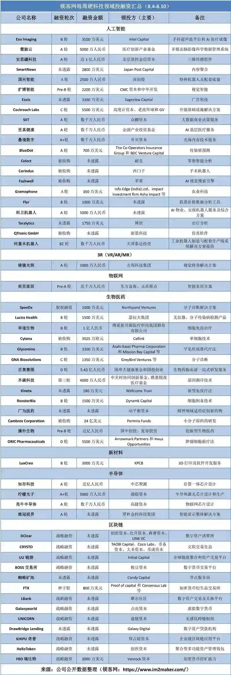 本周硬科技领域投融资事件一共55起,人工智能领域发生17起融资事件和4起收购事件,占比38%;生物医药领域发生12起融资事件和2起收购事件,占比25%;区块链领域发生13起融资事件,占比24%;半导体领域发生4起融资事件,占比7%;3R(VR/AR/MR)、物联网和新材料领域分别发生1起融资事件,分别占比2%。