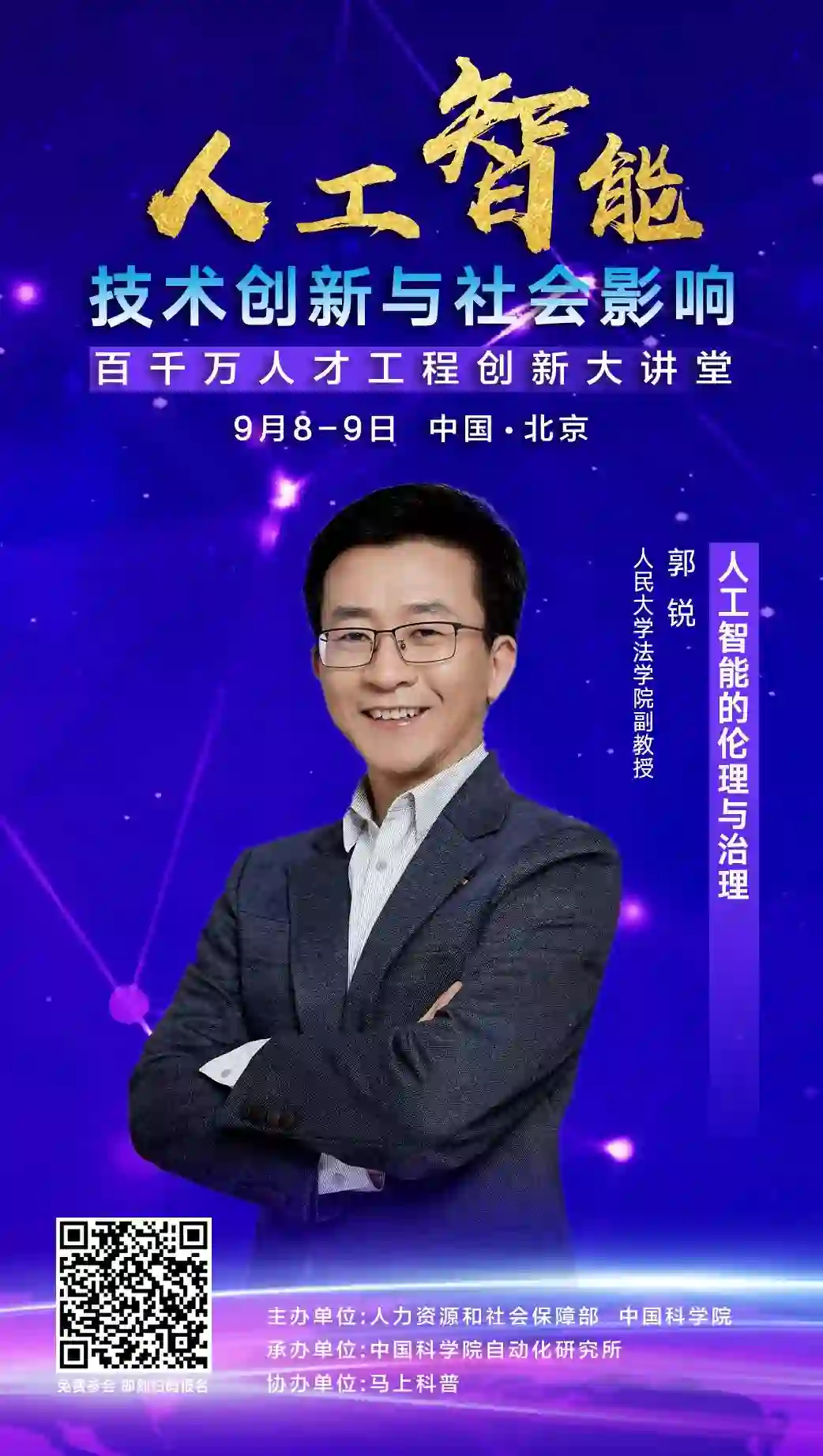 郭锐,中国政法大学法学硕士、美国哈佛大学法学博士。现任中国人民大学法学院教授,主要研究领域包括公司法、金融管制、人工智能的伦理与管制。国家标准委人工智能标准化总体组《人工智能社会伦理专题研究》课题负责人。