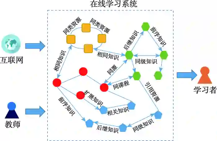 随着人工智能与大数据技术的广泛应用,教育大数据与教育数据挖掘以其丰富的内涵和实用性为智能教育中相关技术的发展注入了新的动力[1]。学习推荐系统是教育数据挖掘领域的重要研究方向,且被广泛地应用于各类智能学习系统[2]。在智能学习系统中,学习者利用各类学习资源加入教学活动,学习资源包括课件、多媒体和模拟场景、练习题和测验,甚至适度和生动的讨论话题等。这些学习资源由于内在关系可能组合形成一个复杂的结构[3],如图1所示,在线学习系统中的各类学习资源通常源自互联网或者教师。图中的正方形、六边形、圆形以及五边形分别表示不同种类的学习资源。同类学习资源之间存在知识的前序、后继、同级的层次关系,这种层次关系也可能存在于不同种类的资源间。而即使学习资源的类型不同,也可能具有相同知识、相同来源,属于相同课程,此外,它们之间还可能存在相互引用、扩展知识的关系。