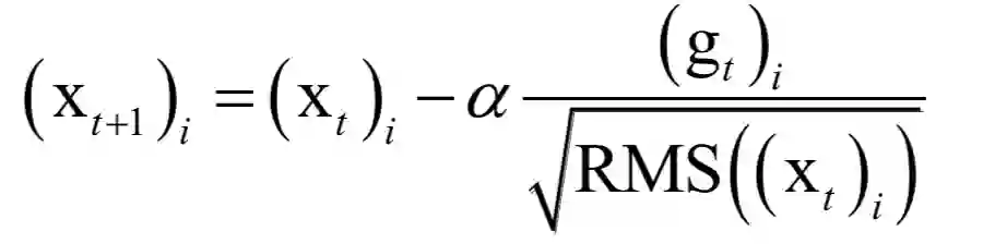 其中α是学习因子,gt是第t次迭代时参数的梯度向量,ε是一个很小的正数,为了避免除0操作,下标i表示向量的分量。和标准梯度下降法唯一不同的是多了分母中的这一项,它累积了到本次迭代为止梯度的历史值信息用于生成梯度下降的系数值。根据上式,历史导数值的绝对值越大分量学习率越小,反之越大。虽然实现了自适应学习率,但这种算法还是存在问题:需要人工设置一个全局的学习率α,随着时间的累积,上式中的分母会越来越大,导致学习率趋向于0,参数无法有效更新。