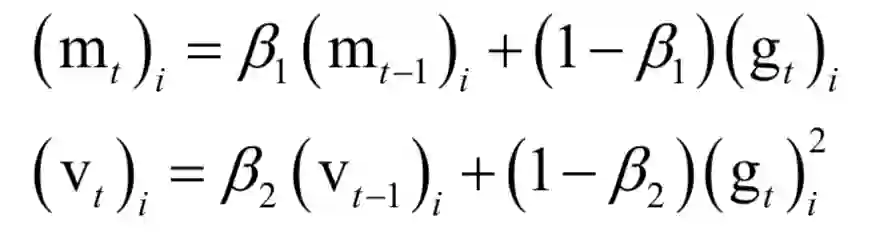 其中β1,β2是人工指定的参数,i为向量的分量下标。依靠这两个值构造参数的更新值,参数的更新公式为: