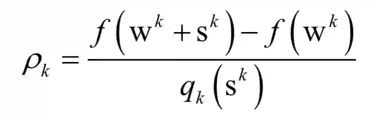 的近似。算法寻找一个sk,在满足约束条件||S||<=Δk下近似最小化qk(S)。接下来检查如下比值以更新wk和Δk: