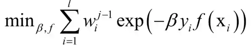 由于强分类器是多个弱分类器的加权和,代入上面的损失函数中,得到算法训练时要优化的目标函数为: