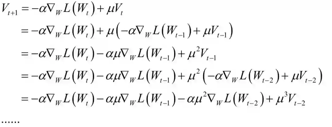 它是上一时刻的动量项与本次梯度值的加权平均值,其中α是学习率,μ是动量项系数。如果按照时间t进行展开,则第t次迭代时使用了从1到t次迭代时的所有梯度值,且老的梯度值安μt的系数指数级衰减: