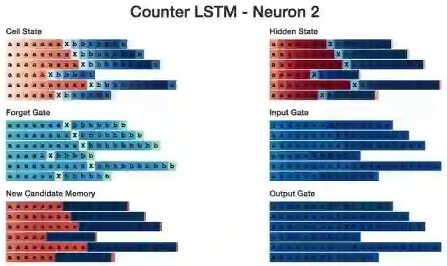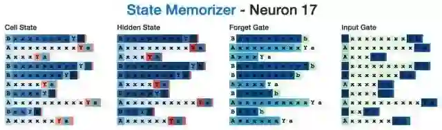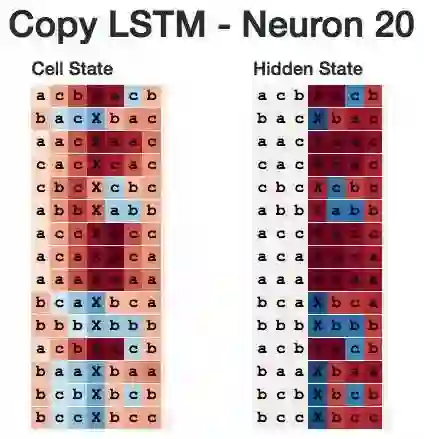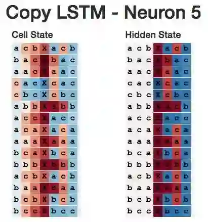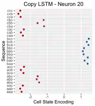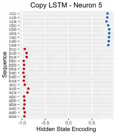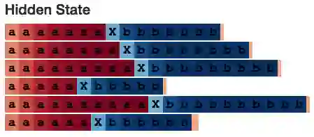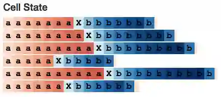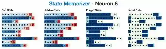 (即一个"A" or "B",紧跟1-10个x's,再跟一个分隔符"Y",结尾是开头字符的小写形式)。在这种情况下,神经网络需要记住它是处于"A" 状态还是 "B"状态中。我们期望找到一个在记忆以"A"开头的序列时激活的神经元,以及一个在记忆以"B"开头的序列时激活的神经元。我们的确找到了。