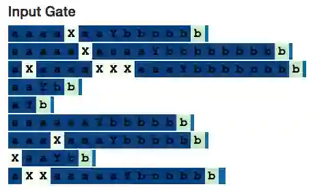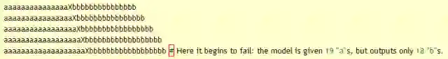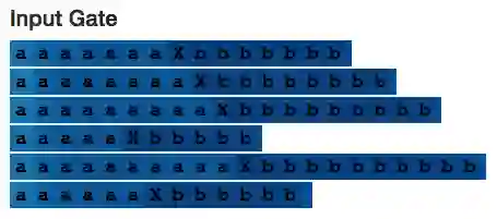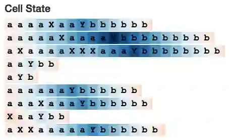 (N个a's 中随机夹杂几个X's,然后加一个分隔符Y,Y后再跟N个b's)。LSTM仍需计算a's的数量,但是这次它需要忽视X's。