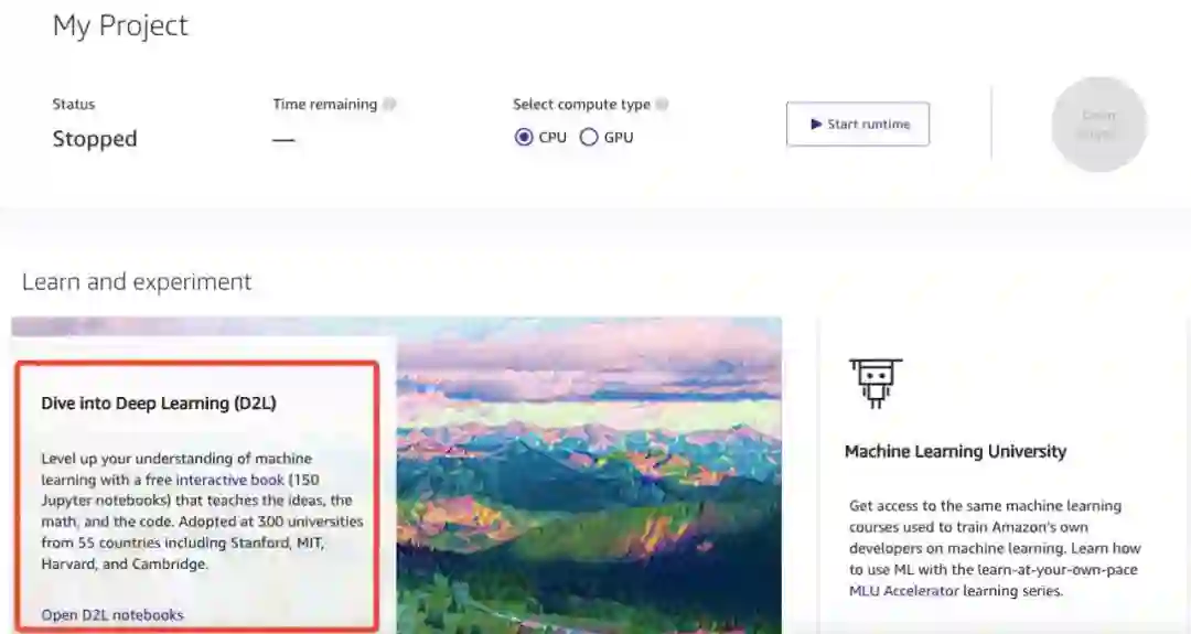 这个平台无偿提供算力不说,还将入门经典「动手学深度学习」放进平台,免费供大家学习和实操,名曰:Amazon SageMaker Studio Lab 。