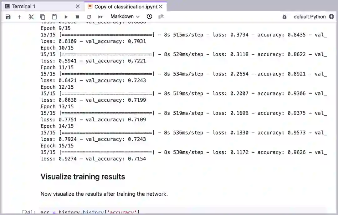 不过该过程允许时间较长,我们在 GPU 选项下训练大约使用7分钟,慢慢等吧!