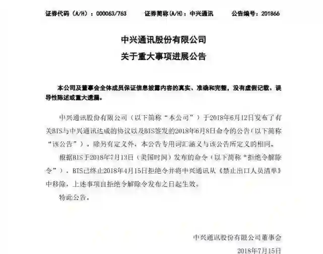 中兴通讯昨日发布公告称,BIS已终止2018年4月15日拒绝令并将中兴通讯从《禁止出口人员清单》中移除,上述事项自拒绝令解除令发布之日起生效。
