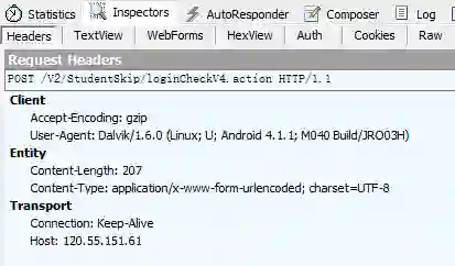import urllib2 from cookielib import CookieJar loginUrl = 'http://120.55.151.61/V2/StudentSkip/loginCheckV4.action' headers = { 'Content-Type': 'application/x-www-form-urlencoded; charset=UTF-8', 'User-Agent': 'Dalvik/1.6.0 (Linux; U; Android 4.1.1; M040 Build/JRO03H)', 'Host': '120.55.151.61', 'Connection': 'Keep-Alive', 'Accept-Encoding': 'gzip', 'Content-Length': '207', } loginData = 'phoneBrand=Meizu&platform=1&deviceCode=868033014919494&account=FCF030E1F2F6341C1C93BE5BBC422A3D&phoneVersion=16&password=A55B48BB75C79200379D82A18C5F47D6&channel=MXMarket&phoneModel=M040&versionNumber=7.2.1&'