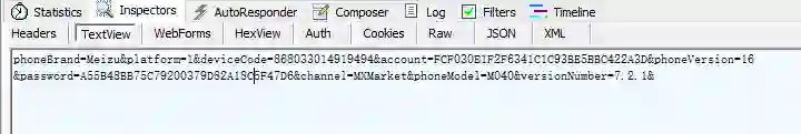 loginData = 'phoneBrand=Meizu&platform=1&deviceCode=868033014919494&account=FCF030E1F2F6341C1C93BE5BBC422A3D&phoneVersion=16&password=A55B48BB75C79200379D82A18C5F47D6&channel=MXMarket&phoneModel=M040&versionNumber=7.2.1&'