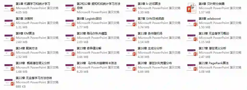 课件总共 22 章,与书籍目录分别对应,前 12 章为监督学习部分,对比第 1 版在监督学习方法上进行了一些修改,但出入不大。