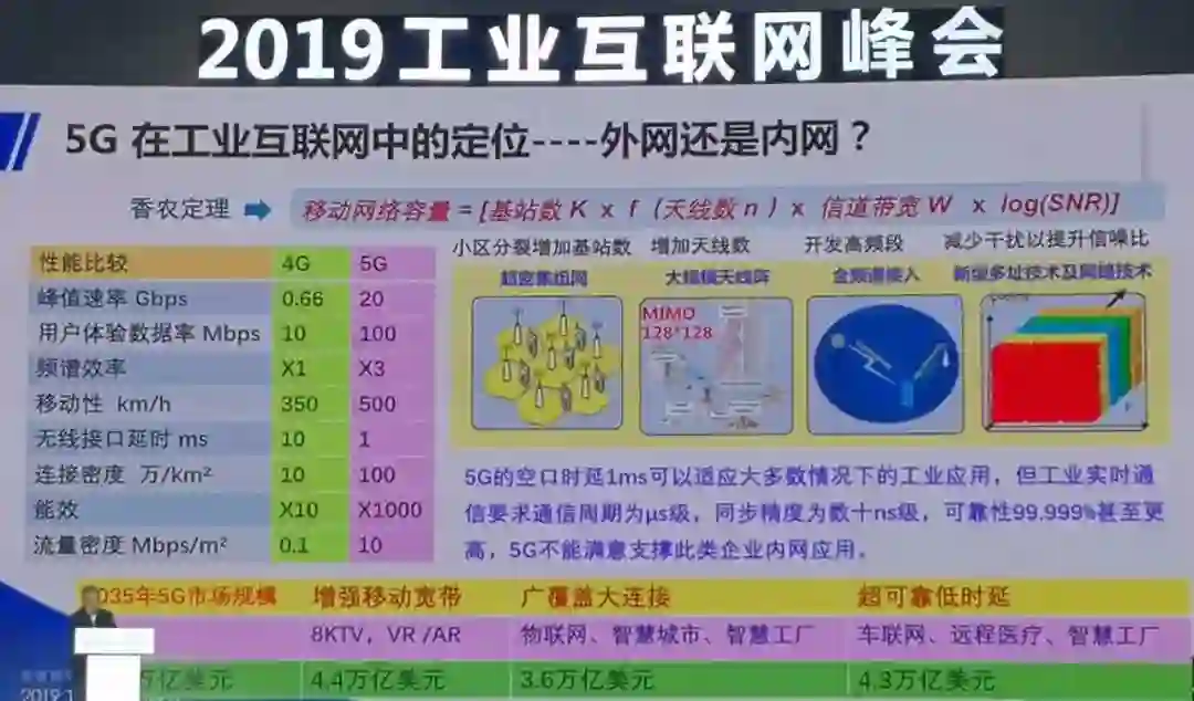 可以说,到2035年,工业互联网会占5G整体收入的80%,但是5G是否适应工业互联网的应用?5G的时延是1 ms,可以适用大多数情况的工业应用。但是工业现实中通信,要求的通信周期是微秒级,同步进度是纳秒级,可靠性五个9,甚至更高。5G现在还不能足够来支撑这么低时延和高可靠的应用。这些低时延、高可靠主要是指内网。