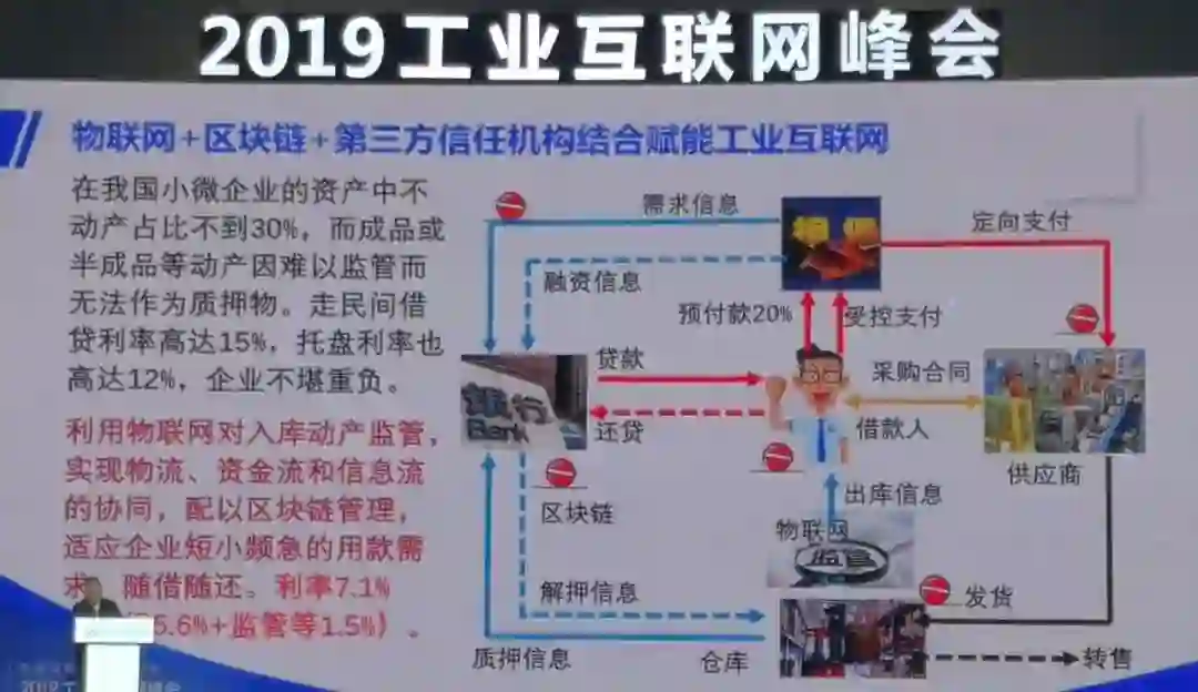 利用物联网对入库动产监督,实现物流、资金流和信息流的协同,配以区块链管理,适应企业短小频急的用款需求,随借随还。所以通过这种方式,用物联网使得利率降到7.1%,也就是说比银行的利率低1.5%。