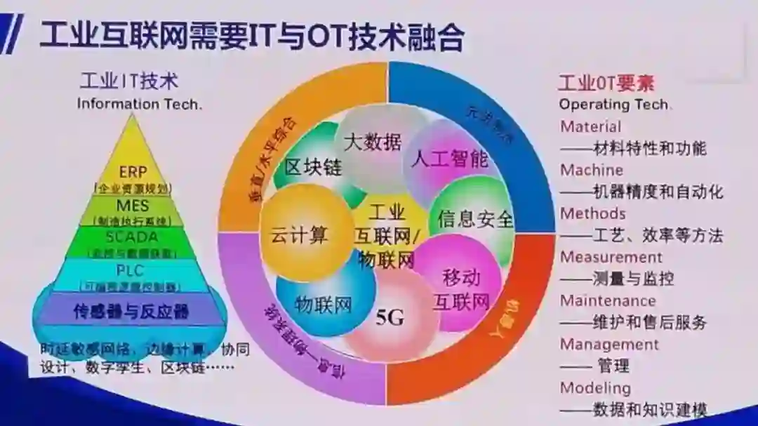 工业上也有IT技术,包括传感器、执行器、监控与数据获取SCADA、制造执行系统MES、可编程逻辑控制器PLC。工业上OT技术包括材料、机器、方法、测量、维护、管理、模型,这两者需要结合,否则工业互联网还是“两张皮”。