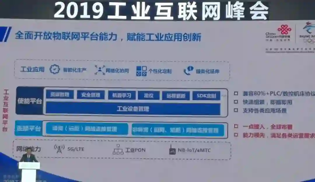 中国联通的工业互联网平台,更多的把设备的管理以及相关的基于连接之上、应用之下的一些垂直行业和通用的视能,包括机器学习等,进行了封装。现在可以兼容80%以上的PLC,包括主流的工业协议。联通提出的是即插即用,就是设备管理和工业平台能够快速用起来。