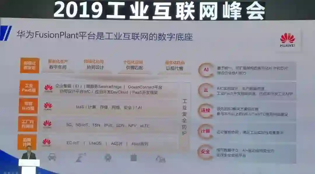 华为的工业互联网平台2018年发布,名为FusionPlant,是工业互联网的底座。华为轮值董事长在2018年10月华为大会上发布了全场景的AI技术,包括昇腾芯片,这些芯片应用在了云里面做推理和训练;也有用在边缘计算中,用在智能设备中的,让机器设备这一层能够很容易地具备新的AI能力,这样边缘和中心云中间的AI就可以协同起来。