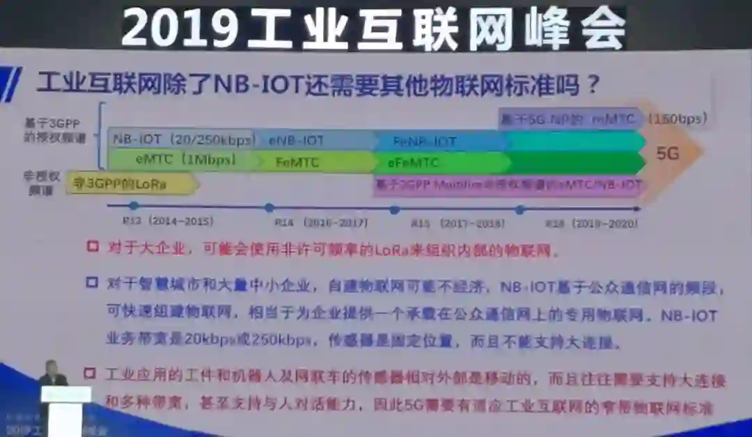 对于大企业可能会用Lora来组织内部的物联网。对于智慧城市和大量中小企业,自建物联网并不经济。基于运营商公网的NB-IoT,带宽并不高,20Kbps或250Kbps,对应的传感器是固定的,不能支撑大连接。工业机器人,传感器是移动的,而且需要大连接和多种带宽,甚至需要跟人对话,所以5G需要开发一些适应工业互联网的窄带物联网标准。