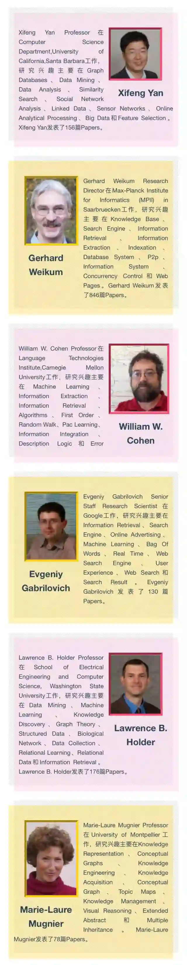 有关知识图谱的研究主要以Xifeng Yan、Gerhard Weikum、William W. Cohen、Evgeniy Gabrilovich、Lawrence B. Holder、Marie-Laure Mugnier等人为首的学派构成。