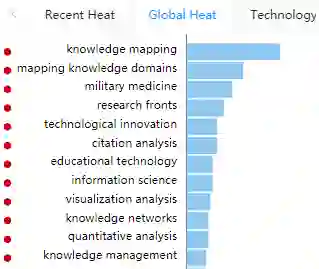 近期知识谱图的研究热点主要在knowledge mapping、knowledge networks、research focuses、performance evaluation等领域。