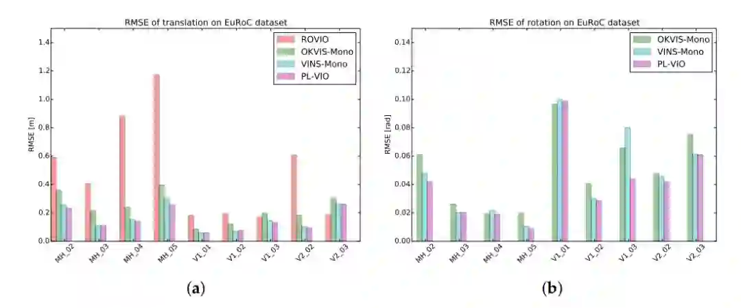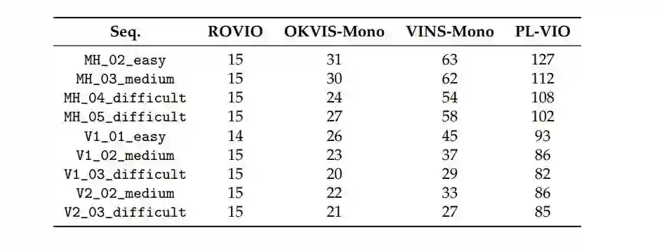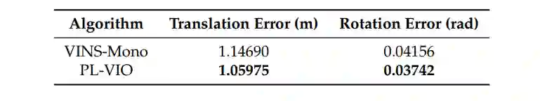 作者使用两个公开基准数据集来评测PL-VIO:EuRoc MAV数据集和PennCOSYVIO数据集。通过和目前最先进的三种单目VIO(ROVIO、OKVIS、VINS)进行比较,验证了PL-VIO的优点。ROVIO是基于扩展卡尔曼滤波器(EKF)的紧耦合的VIO系统,它直接利用图像的亮度误差来寻找更新过程中的最优状态。OKVIS是一种具有点特征的滑动窗口优化算法,适用于单目或双目模式。VINS-Mono是一个完整的VIO-SLAM系统,它利用点特征来优化IMU在滑动窗口中的状态,并可以进行回环检测。所有实验均在Intel Core i7-6700HQ CPU 2.60 GHz, 16gb RAM, ROS dynamics的计算机上进行。