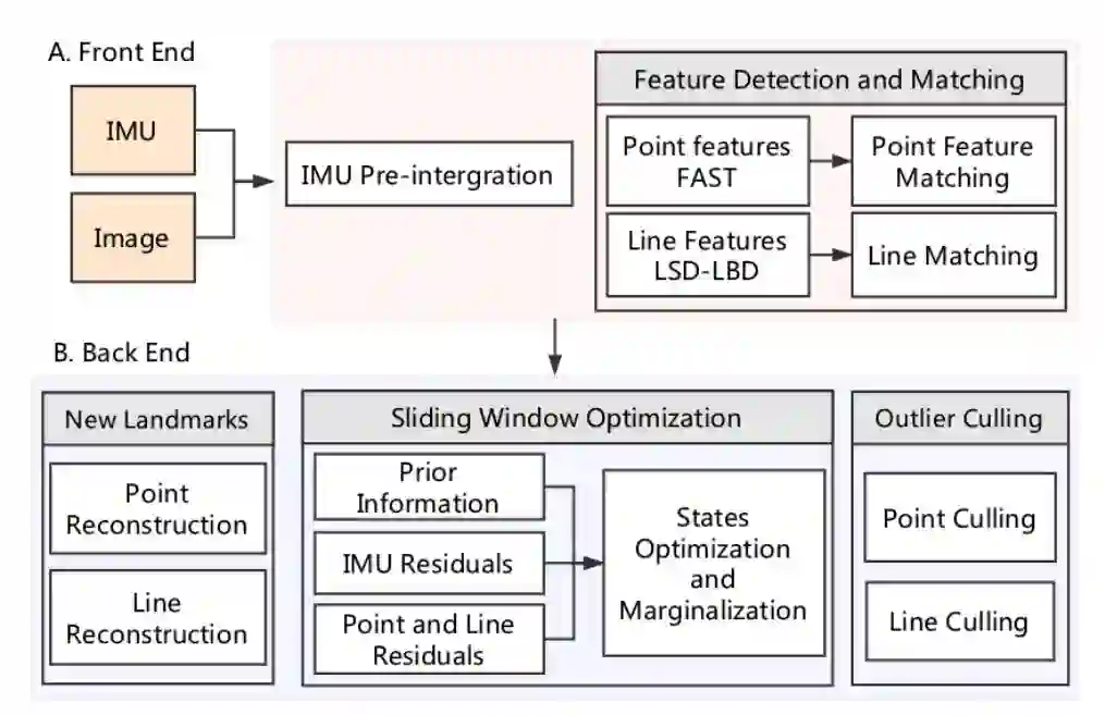 图1 本文PL-VIO系统框图。A是从原始测量提取信息的前端;B是估计和优化状态变量的后端