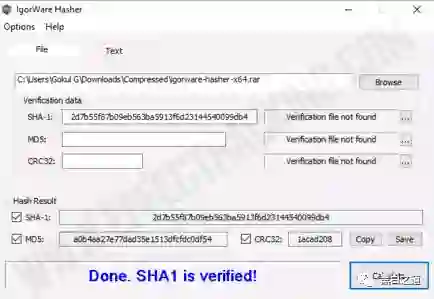 如果文件正常,程序将显示一条消息,说明散列已经过验证(参见下图)。