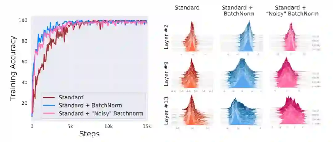 图 2:分布稳定性和 BatchNorm 性能之间的联系:我们比较了没有 BatchNorm 的 VGG 网络(Standard)、有 BatchNorm 的 VGG 网络(Standard+BatchNorm)和在 BatchNorm 层添加了显式「协方差偏移」的 VGG 网络(Standard+「Noisy」BatchNorm)。在最后一种情况中,我们通过添加独立于每个批归一化激活值的时变、非零均值和非单位方差噪声引入分布的不稳定性。尽管完全分布不稳定,但「Noisy」BatchNorm 模型的性能几乎与标准 BatchNorm 模型相当。我们采样了给定层的激活值并可视化了其分布(参见图 8)。