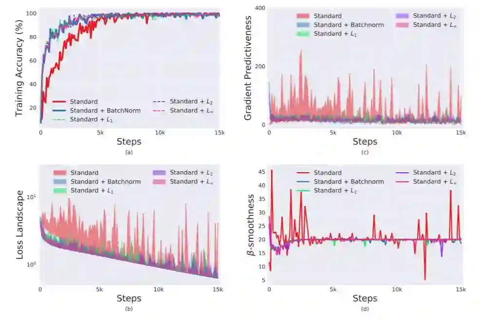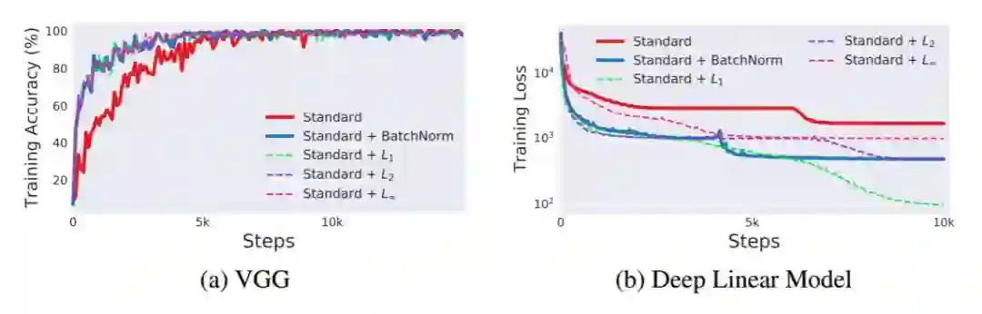 最后我们发现,这种平滑效果并不与 BatchNorm 唯一相关。其他一些自然归一化技术都有相似的效果(有时甚至更强)。即这些方法都提供了类似的训练性能提升。